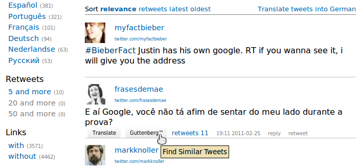 Da Jetwick ja eine Weile aus technischen Gründen ohne den Duplikaterkennungs-Button auskommen musste, packte ich gestern die Gelegenheit beim Schopfe und erweckte den Button im neuem Lichte. Der Button ist besonders bei eigenen Tweets oder bei Tweet mit vielen Retweets interessant: