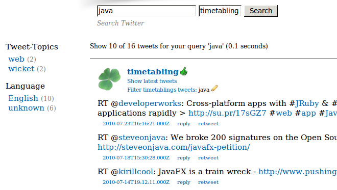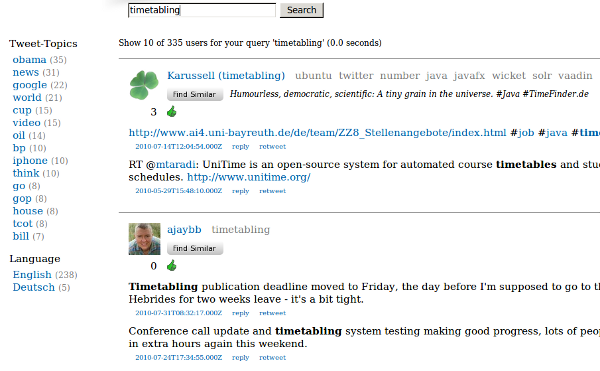 Not only the find similar feature is nice, also the topics (on the right side of the user name; gray) give a good impression about which topic a user tweets about. The first usable prototype was ready within one week! I used lucene, vaadin and db4o. But I needed facets so I switched from lucene to solr. The tranformation took only ~2 hours. Really! Test based programming rocks 😉 !